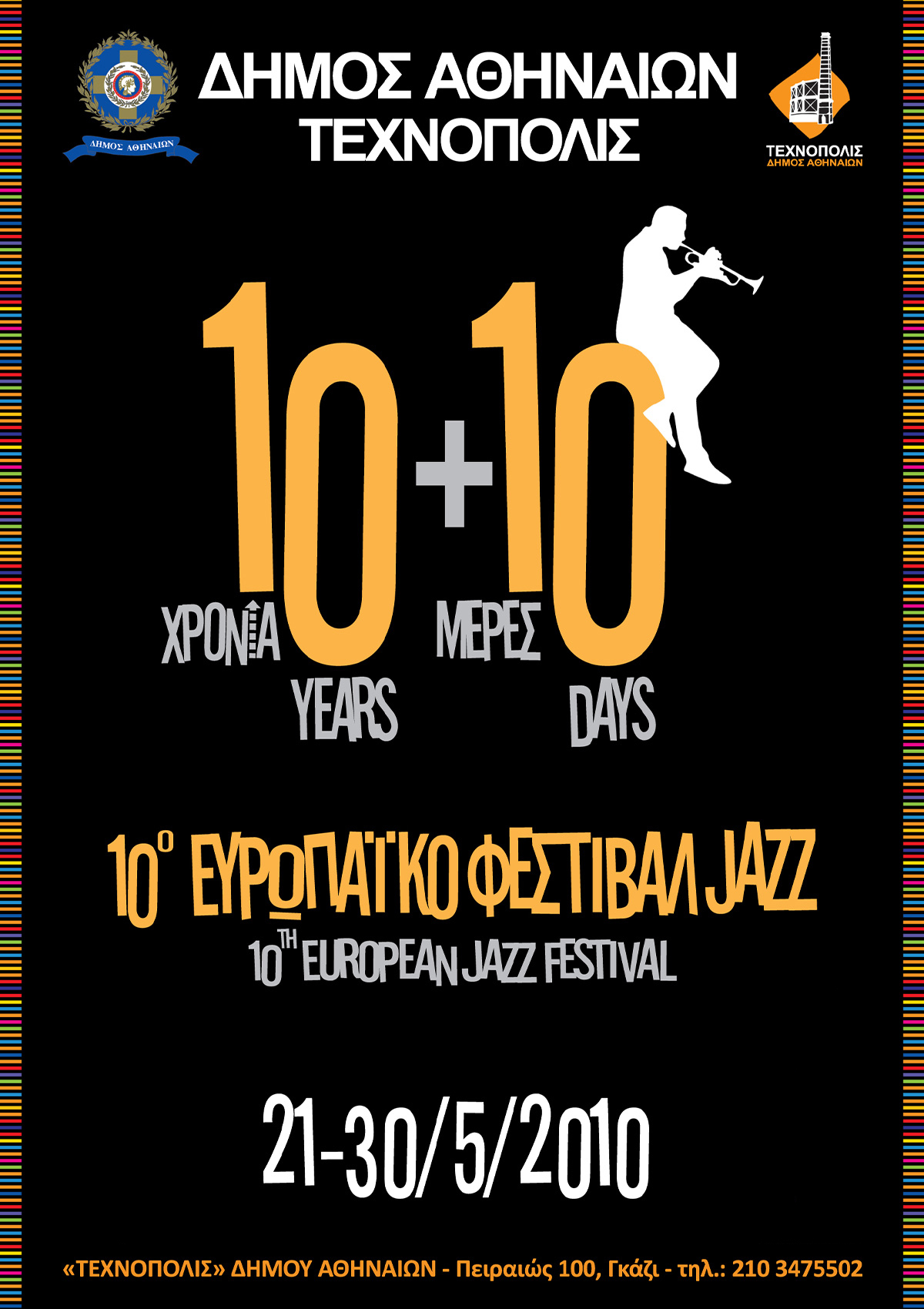 The European Jazz Festival celebrated its 10th anniversary, meeting the faithful music-loving public of the capital in Technopolis of the Municipality of Athens from May 21 to 30, 2010. During the 10-day Festival, organized by Technopolis in collaboration with the Embassies and Educational Institutes of the member countries of the European Union in Athens, twenty-five of the most important bands of the genre participated.