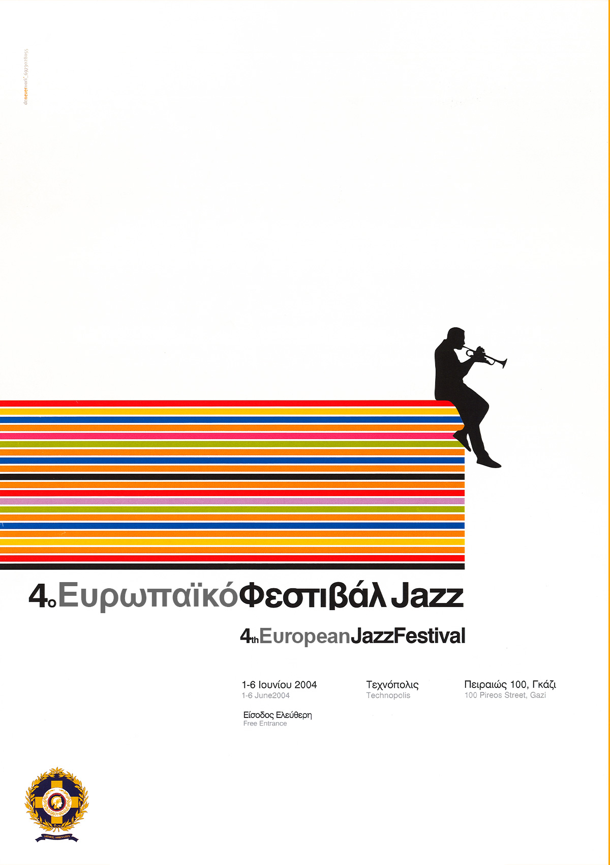The fourth European Jazz Festival in Athens, with the participation of 21 countries - members of the enlarged European Union, was organized, under its auspices, by the Technopolis of the Municipality of Athens (Piraeus 100, Gazi) from June 1 to 6, 2004.